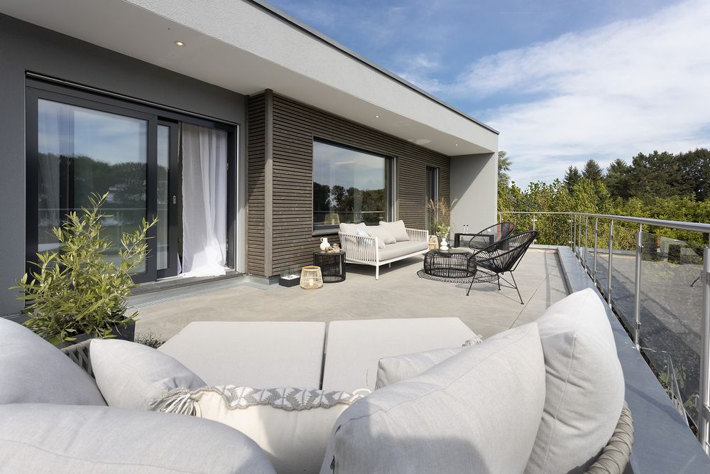 Die Baufamilie hat sich für ein Haus im Bauhausstil mit Luftbalken und Flachdach, einem großzügigen, überdachten Eingangsbereich, einer Holzlamellenfassade und einem großen Süd-Balkon entschieden. Im Erdgeschoss lädt der offene Wohn-/Ess- und Kochbereich mit Galerie zum zwanglosen Zusammensein, Kochen sowie zu ausgelassenen Küchen-Partys mit Freunden ein. Der Kamin und die gemütliche Kuschelnische strahlen Wärme aus und schaffen eine gemütliche Atmosphäre, so dass man sich im neuen Heim von Anfang an so richtig wohlfühlt.