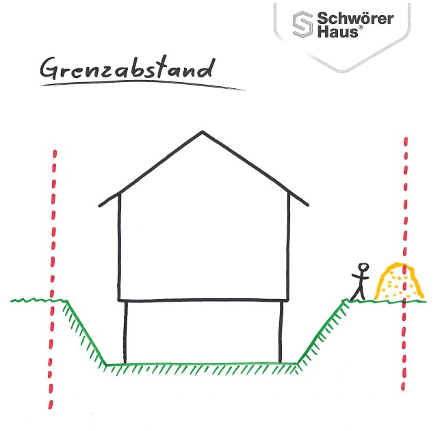 Der Grenzabstand ist der Abstand, der zwischen Haus und Grundstücksgrenze liegt. Dieser muss eingehalten werden und stellt eine wichtige Kenngröße dar. Bei Bedarf, muss er groß genug sein, damit der Aushub für Bodenplatte oder Keller auch innerhalb des Grenzabstands gelagert werden kann.