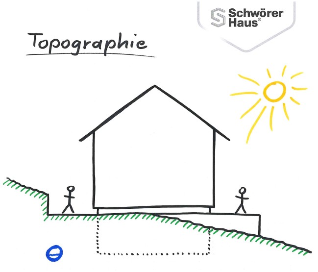 Die Topographie, also die Form des Geländes, ist maßgeblich, ob besser ein Keller oder eine Bodenplatte zur Ausführung kommen sollte.