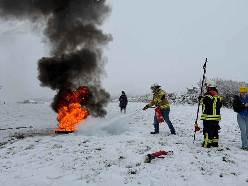 An der Station Feuerlöschen wurde das richtige Löschen von Bränden geübt. Zunächst erhielten die Auszubildenden eine Unterweisung zu den verschiedenen Arten von Feuerlöschern sowie zu den Brandklassen. Anschließend wurde die korrekte Bedienung eines Feuerlöschers erklärt. Zum Abschluss durfte jede Person selbst einen Flüssigkeitsbrand mit einem Feuerlöscher löschen.