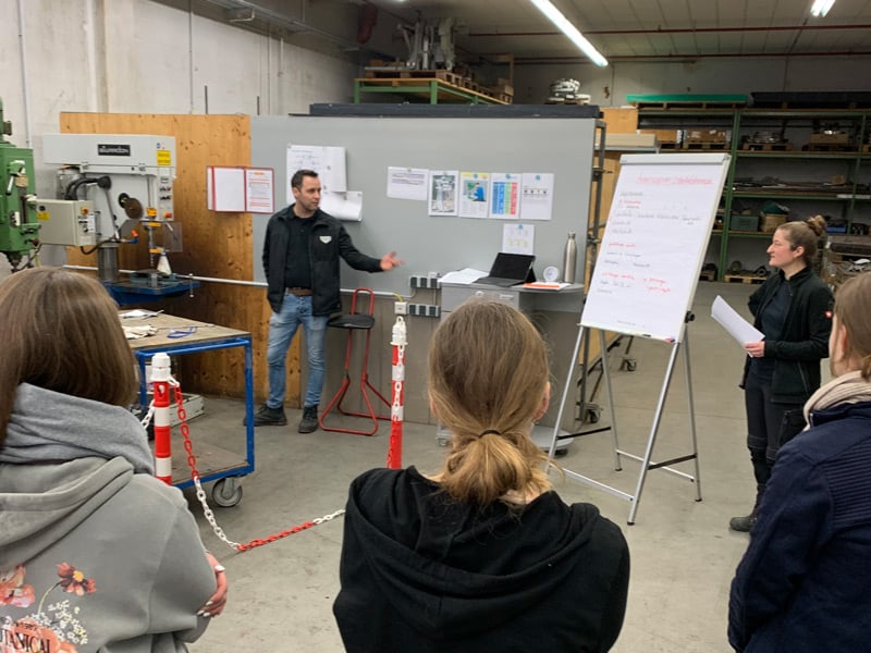 Anschließend folgte die Station Gefährdungsbeurteilung. Anhand einer Ständerbohrmaschine erstellten die Gruppen eigenständig eine Gefährdungsbeurteilung. Gefahren wurden identifiziert, Risiken bewertet und geeignete Schutzmaßnahmen ausgewählt. Auch die Dokumentation sowie die Arbeit mit der Risikomatrix waren Teil der Übung.