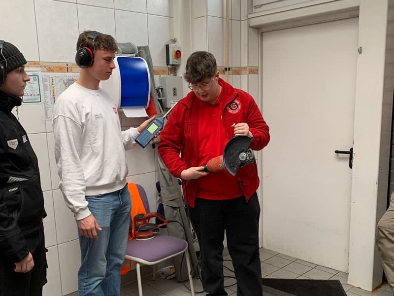 An der Station Lärmtest wurden verschiedene Arten von Gehörschutz vorgestellt und direkt getestet. Mithilfe realitätsnaher Lärmsituationen und eines Dezibel-Messgeräts konnten die Azubis die Wirkung unterschiedlicher Schutzmaßnahmen vergleichen. Ein Film zur Simulation von Hörverlust machte deutlich, wie stark sich Lärmschäden auf Berufs- und Privatleben auswirken können.