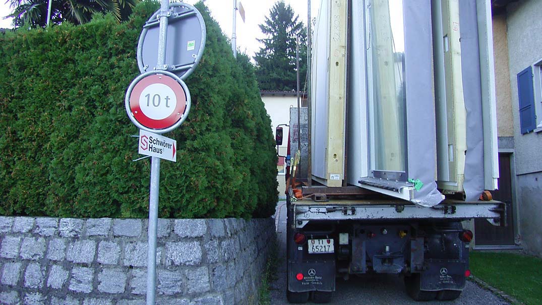 Nach der ersten Besichtigung und dem Baustellengespräch war Bauleiter Müller klar, dass dort mit der vorhandenen Fahrzeugpalette nichts zu machen ist. SchwörerHaus selbst hat sich auf schwer zugängliche Bauplätze eingestellt und spezielle Auflieger für den Transport der Bauteile angeschafft, die kürzer sind und über spezielle Lenkachsen verfügen, sodass enge, kurvenreiche Zufahrten angefahren werden können – ein enormer Vorteil, gerade für den Hausbau in der Schweiz. Doch selbst mit diesen Fahrzeugen war die Baustelle nicht zu erreichen. Es folgten mehrere Testfahrten und auch hier kam man schnell an die Grenzen. Herausstehende Dachvorsprüngen, Engstellen in Kurven und nicht zuletzt die Platzverhältnisse am Grundstück selbst stellten immer neue Probleme dar. Daher musste der Bautrupp und Bauleiter Müller komplett umdenken und nach weiteren Lösungen suchen.