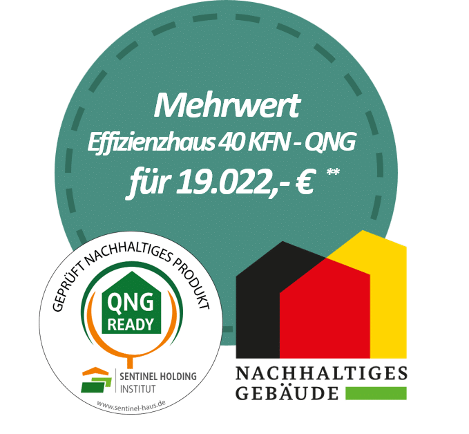 ** Das Aktionshaus E2 20-180.1in bezugsfertiger Ausstattung können Sie für nur 19.022,- € zu einem förderfähigen Haus KFN – QNG ergänzen (Effizienzhaus 40 mit firmeneigenen Auditor, inklusive Photovoltaikanlage).