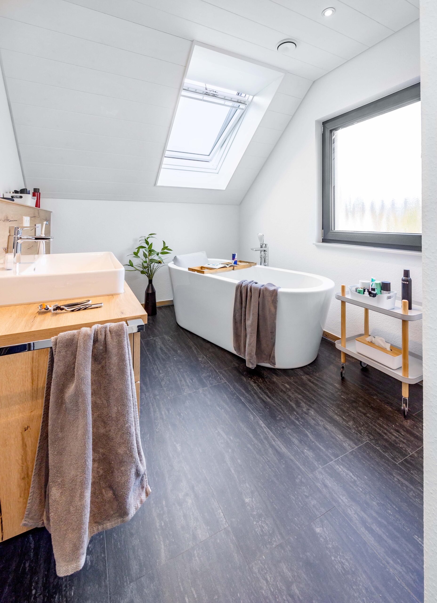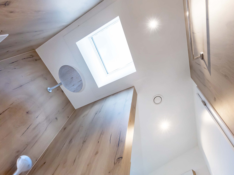 Tageslicht spielt für die Familie Greiner eine wichtige Rolle. Da die benachbarten Gebäude relativ dicht zum Haus der Greiners stehen, brauchte es eine geschickte Fensterplanung, um die Privatsphäre der Familie zu gewährleisten. Zusätzlich wird daher von oben mithilfe von Flachdachfenstern belichtet. „Von allein wären wir da nicht draufgekommen“, versichert Kati Greiner. „Wir schauen vom Bett aus in den Sternenhimmel und duschen mit Tageslicht von oben und niemand schaut rein. Das ist schon toll.“ Auch die Jungs im Dachgeschoss profitieren von der Profi-Planung. So sind alle Zimmer mittels zweier Fenster belichtet – von der Seite und von oben – und das im Norden hat sogar ein doppeltes Dachflächenfenster bekommen.