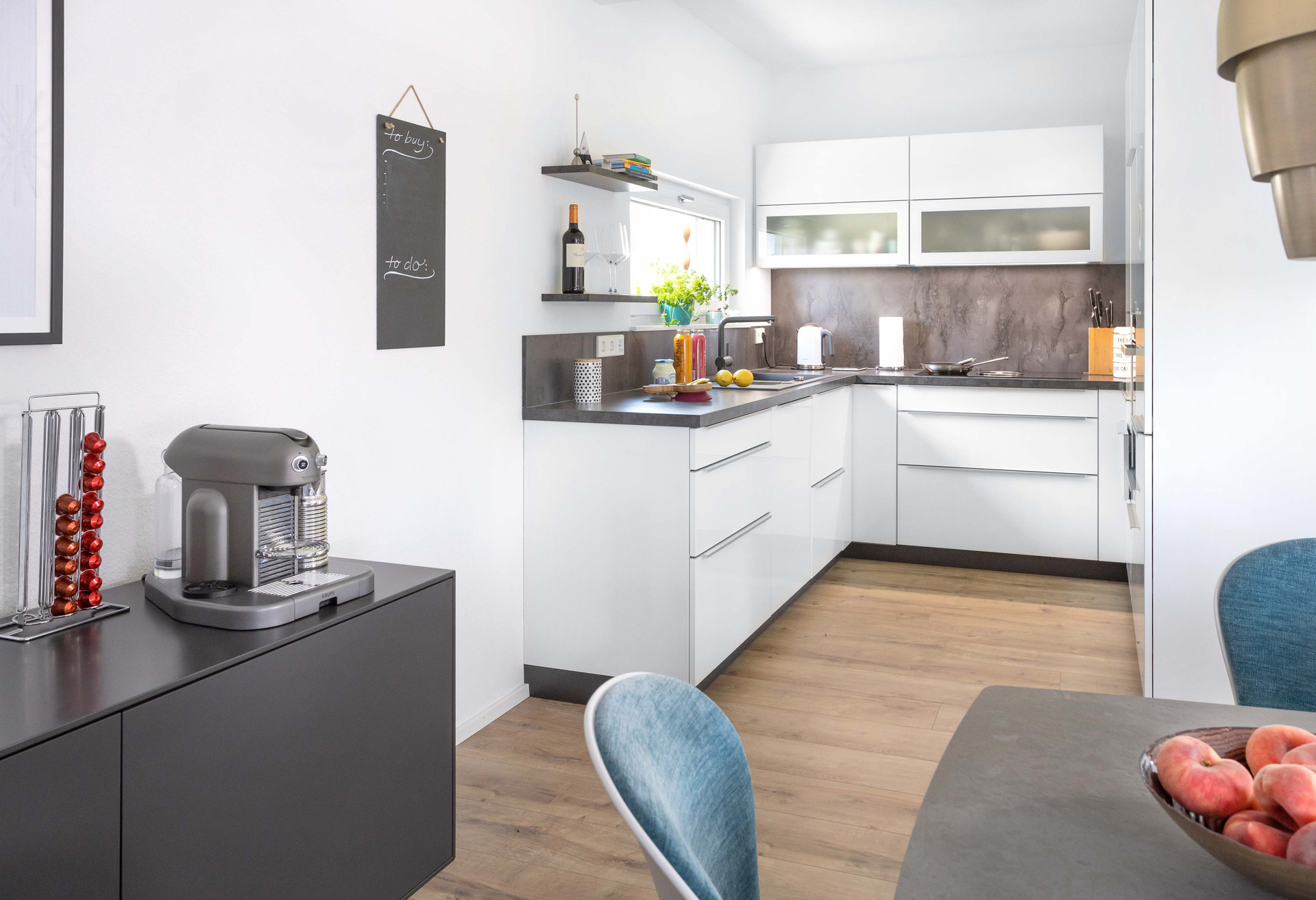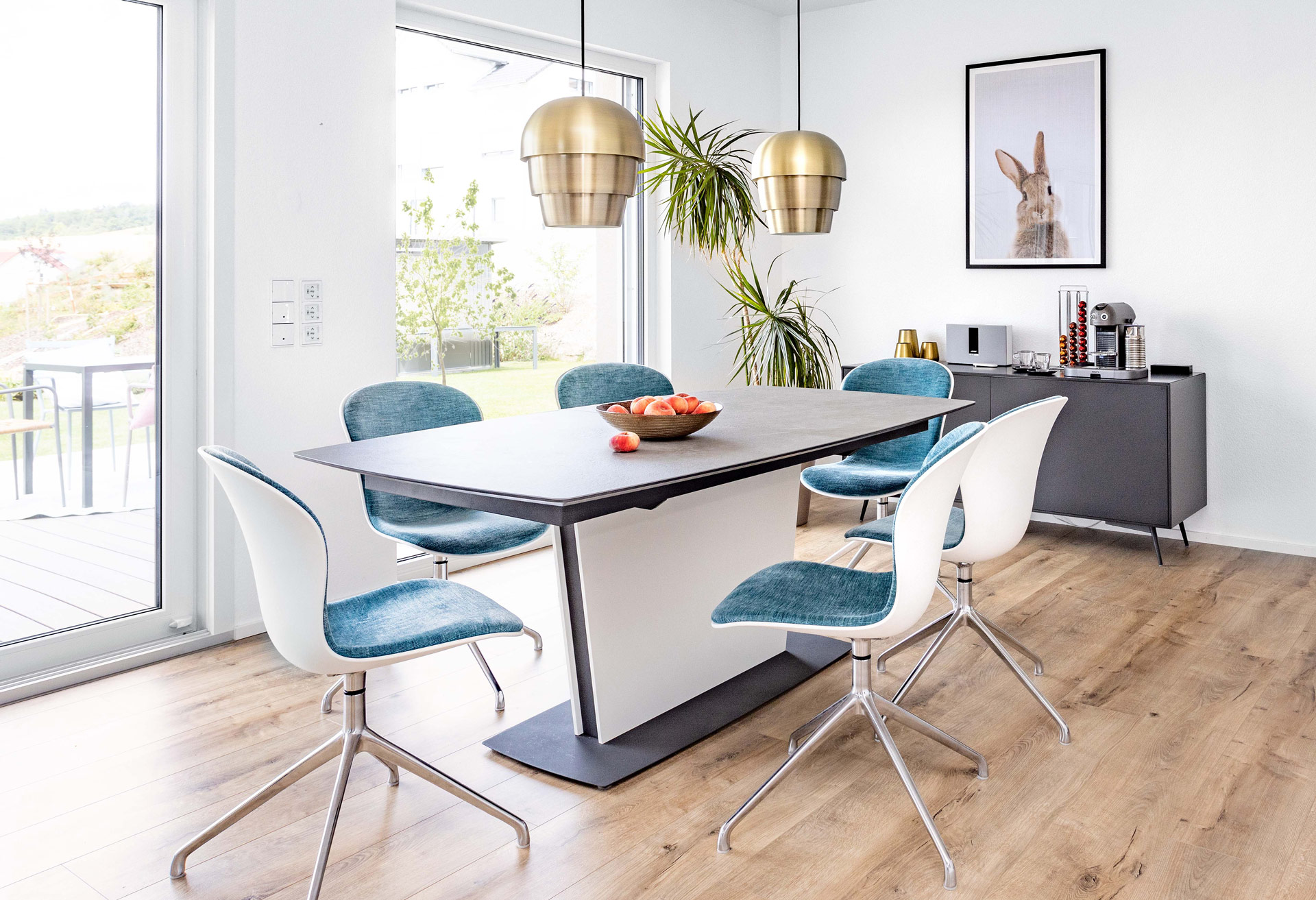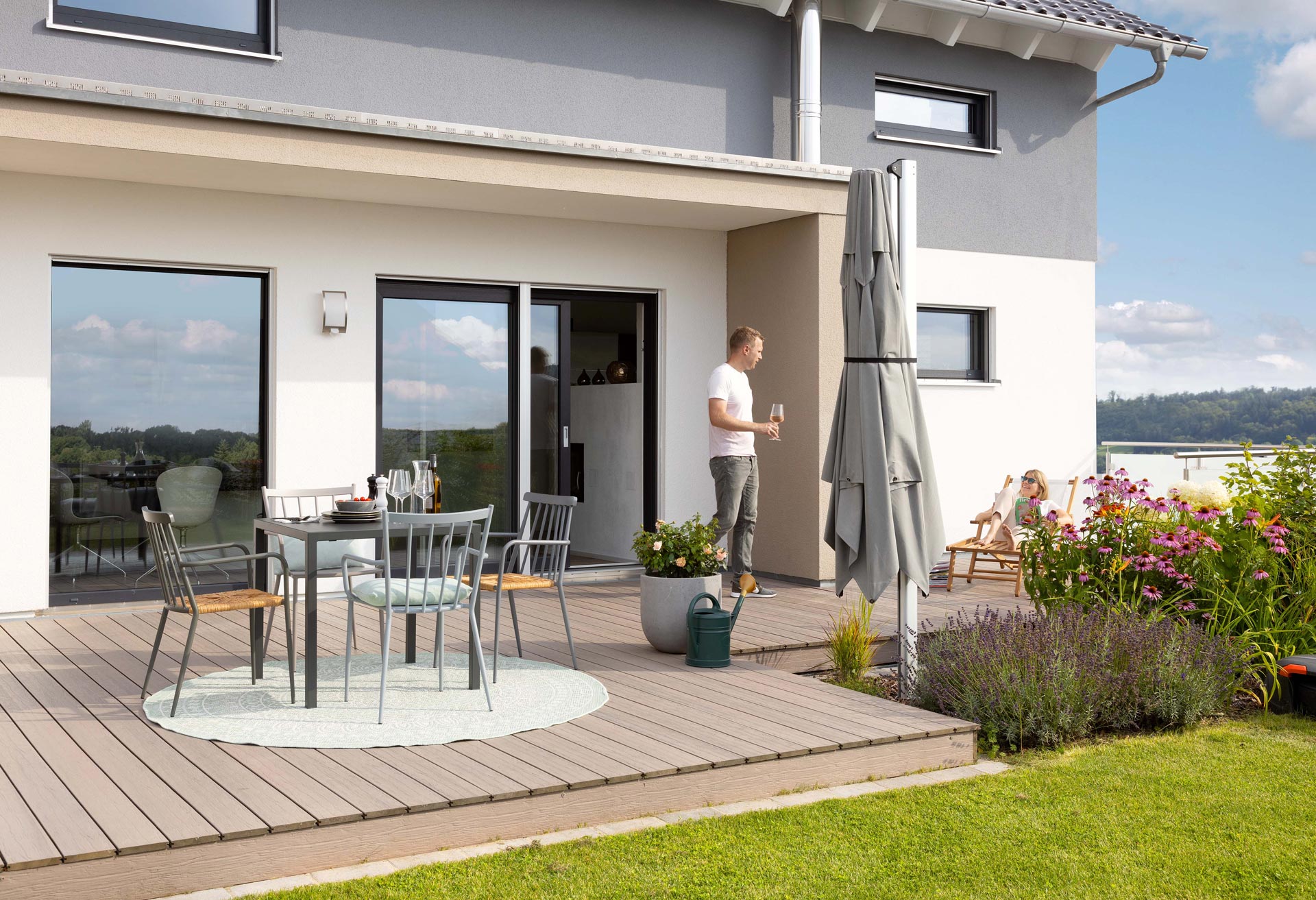 Familie Schneider war überrascht, wie viele gestalterische Optionen sich ihnen bei Planung und Einrichtung ihres Schwörer-Hauses boten. Selbst den Grundriss konnten sie an ihre Wohnvorstellungen anpassen. Über die in ihrer Farbe abgesetzten Stockwerke bekommt das am Hang gelegenen Haus harmonische Proportionen. Dezente Akzente setzen die unterschiedlichen Fensterformate und der feststehende Sonnenschutz, der die Terrasse buchstäblich einrahmt und gleichzeitig einen sichtgeschützten Bereich zum Sonnenbaden schafft.