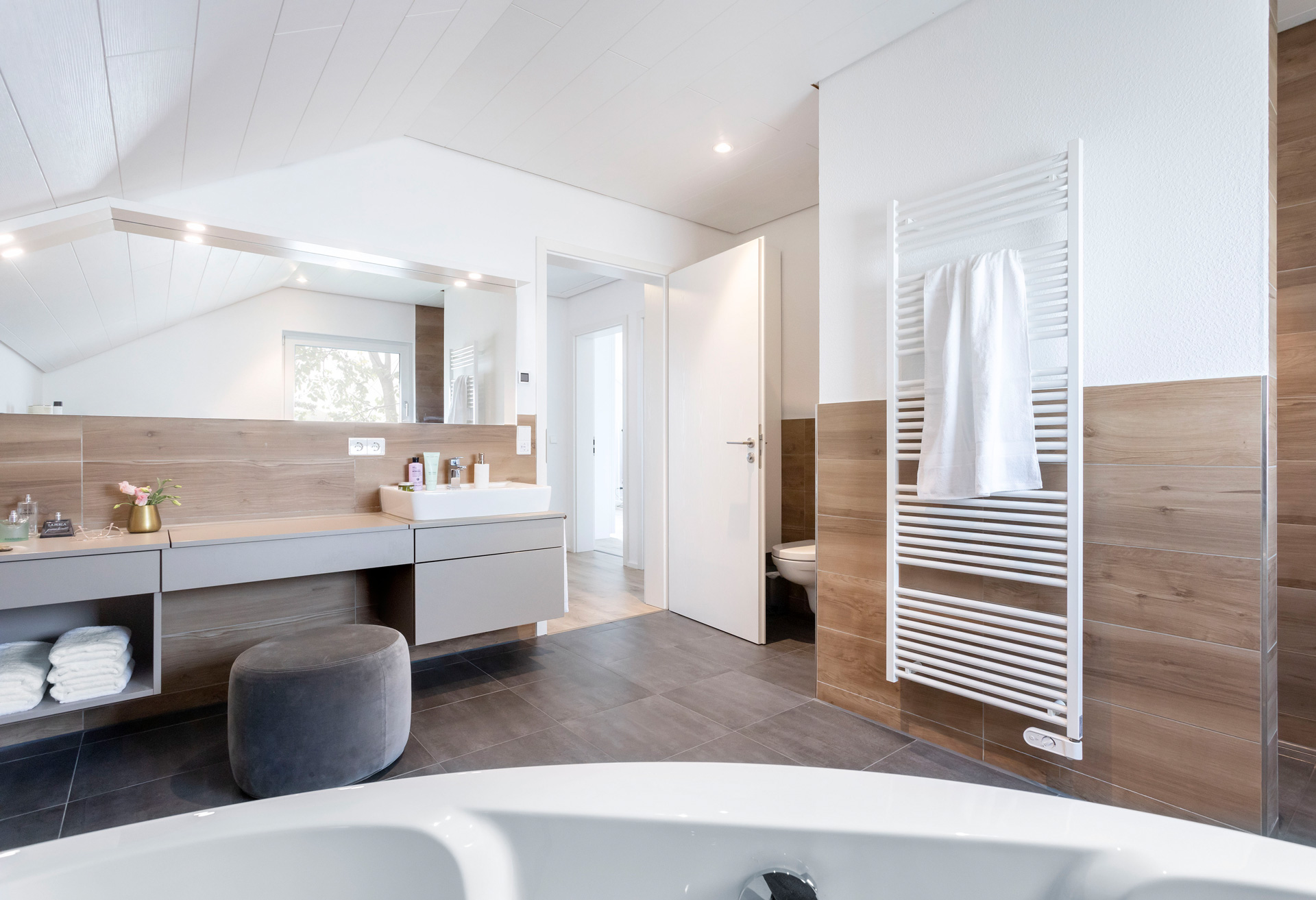 Die Familie Schneider möchte beim Erscheinungsbild ihres Hauses keine Extravaganz, die Einrichtung ist ihnen aber sehr wichtig. Sie soll abgestimmt sein und einen besonderen Touch haben, hochwertig und individuell. Einen Grundstock ihrer Möbel von BoConcept haben die beiden fürs neue Haus mitgebracht. Auch hier handelt das Paar nach dem Grundsatz: Qualität vor Quantität. „Wenn wir uns ein neues Stück anschaffen wollen, dann sparen wir auch schon mal drauf“, erzählt Andreas Schneider. Bei der Bemusterung im Schwörer-Ausstattungszentrum hat Herr Schneider seine Frau auf einen Waschtisch mit integriertem Schminktisch aus der Schwörer-Designschreinerei aufmerksam gemacht. Heute ist er das Herz des Badezimmers und ein Lieblingsstück der Bauherrin.